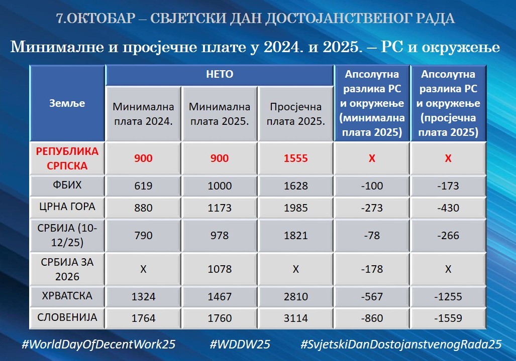 Na današnjoj konferenciji za novinare u Banjaluci je rečeno da se najniža plata nije mijenjala dvije godine i iznosi za NK radnike 900 KM. Tvrdnje poslovne zajednice da se najniža plata ne treba mijenjati i da je u okviru najniže plate u okruženju, nisu tačne. U FBiH najniža plata je 1.000 KM, Crnoj Gori 1173 KM, Srbiji u ovom momentu 978, a od januara 2026. godine iznosiće 1078 KM, u Hrvatskoj 1467 KM, dok je u Sloveniji najniža plata 1760 KM. Navedeni iznosi najnižih plata u navedenim zemljama značajno su rasli u ovoj u odnosu na 2024. godinu.