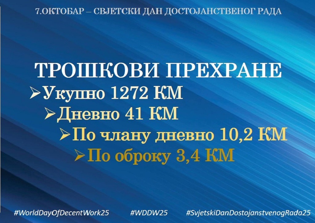 Radnici u Srpskoj dostojanstveno rade, ali nisu dostojanstveno plaćeni, poruka je sa konferencije za novinare, koja je održana juče u Banjaluci, povodom Svjetskog dana dostojanstvenog rada. Božana Radomir, stručni saradnik za ekonomska pitanja u Savezu sindikata Republike Srpske podsjetila je javnost da je sindikalna potrošačka korpa za avgust mjesec ove godine iznosila 2.759 KM i prosječna neto plata od 1555 KM je pokriva sa 56,36%. Samo za prehranu iz sindikalne korpe porodice su morale izdvojiti 1.272 KM.