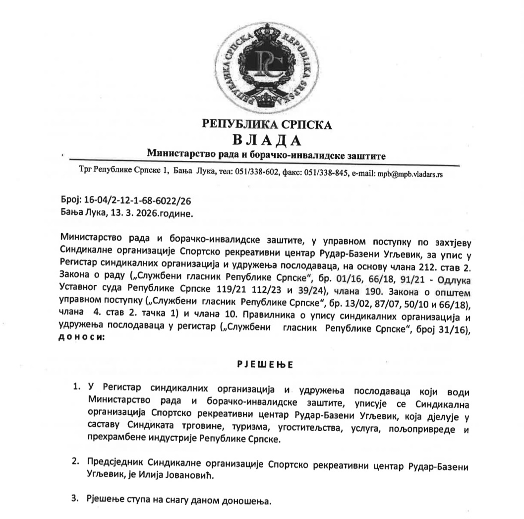 У Спортско рекреативном центру Рудар – Базени Угљевик основана је Синдикална организација, која ће дјеловати у оквиру Синдиката трговине, туризма, угоститељства, услуга, пољопривреде и прехрамбене индустрије Републике Српске (СТУП РС).